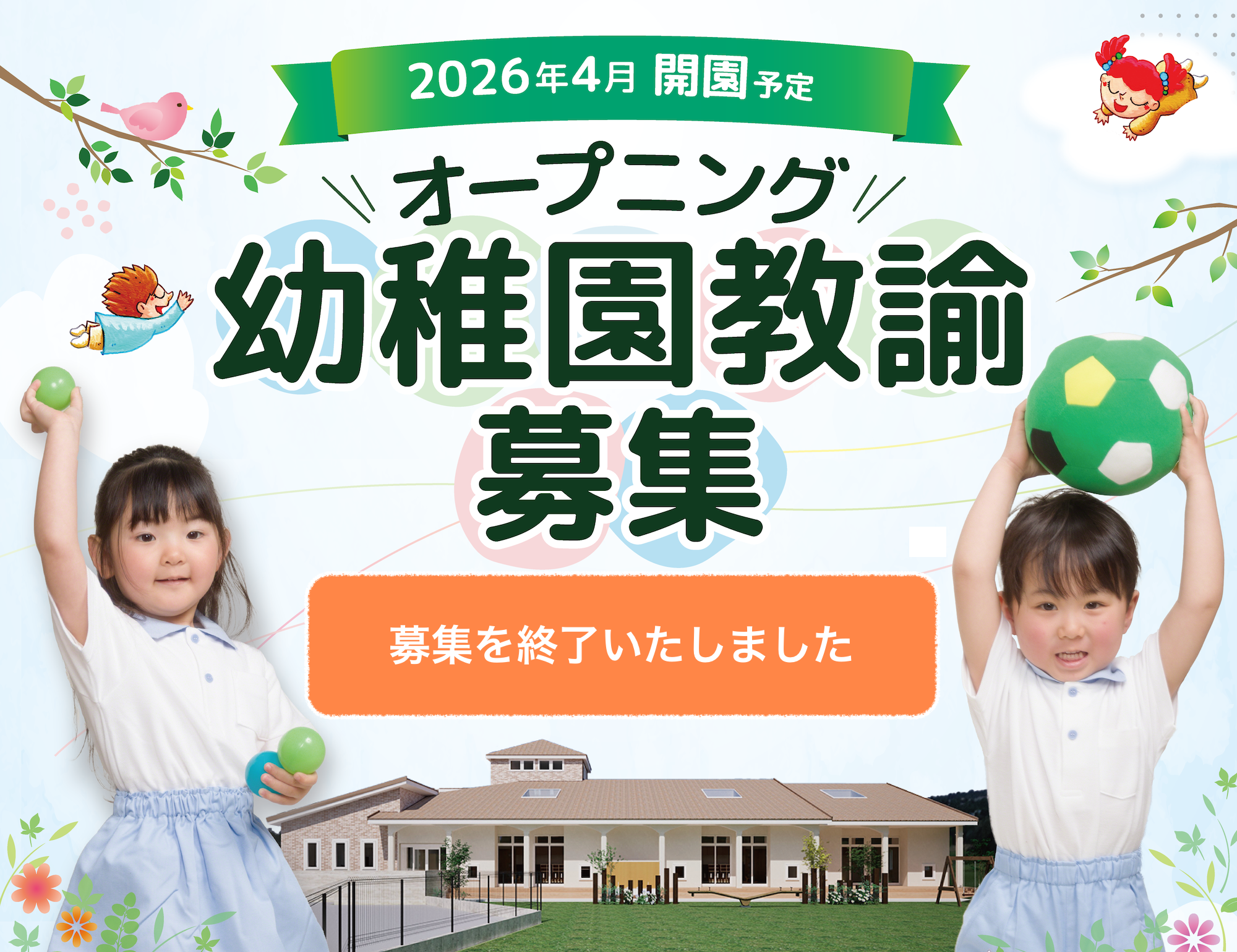 自然豊かな新しい園舎で、子どもたちがのびのびとまなび、あそぶ環境を一緒に作っていきませんか。